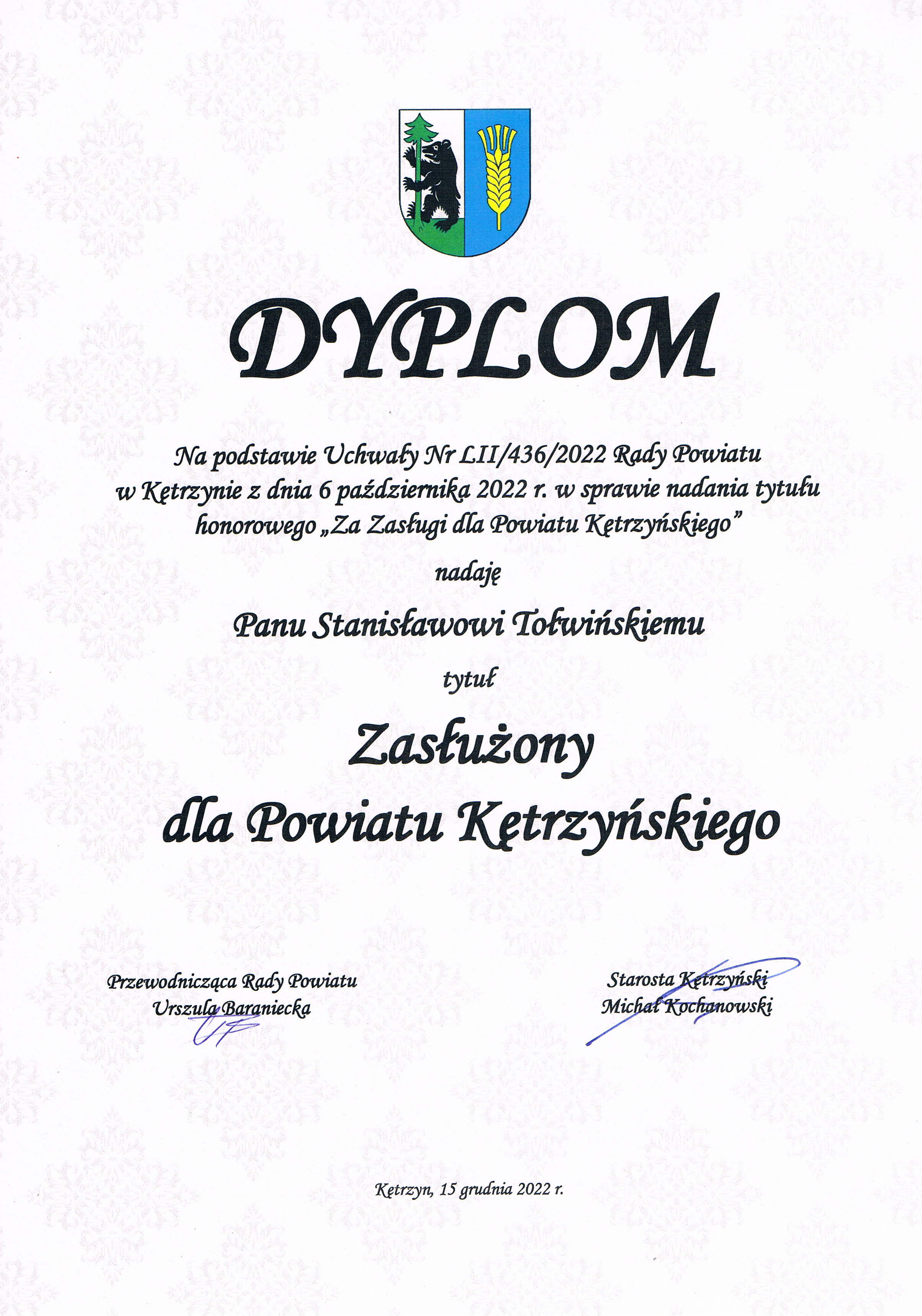 Stanisław Tołwiński to zaangażowany społecznik nie szczędzący swojego jak i rodziny czasu oraz środków materialnych na rzecz realizowanych misji publicznych (ogólnopolskich i regionalnych). W okresie ponad 25 lat z wielką pasją jest zaangażowany dla wielu inicjatyw realizowanych - służących szczególnie społeczeństwu Krainy Wielkich Jezior Mazurskich jak i międzynarodowej promocji Polski a w tym Województwa Warmińsko-Mazurskiego. W dowód uznania za aktywność i oceniany dorobek w regionie został wyróżniony ZA ZASŁUGI DLA WOJEWÓDZTWA WARMIŃSKO-MAZURSKIEGO (2006) , MEDALEM ZA SZCZEGÓLNE ZASŁUGI DLA MIASTA GIŻYCKO (2015), TYTUŁEM I STATUETKĄ OSOBOWOŚĆ ROKU 2015 WARMII I MAZUR oraz ostatnio (X.2022) został uhonorowany tytułem ZASŁUŻONY DLA POWIATU KĘTRZYŃSKIEGO i okolicznościową STATUETKĄ.